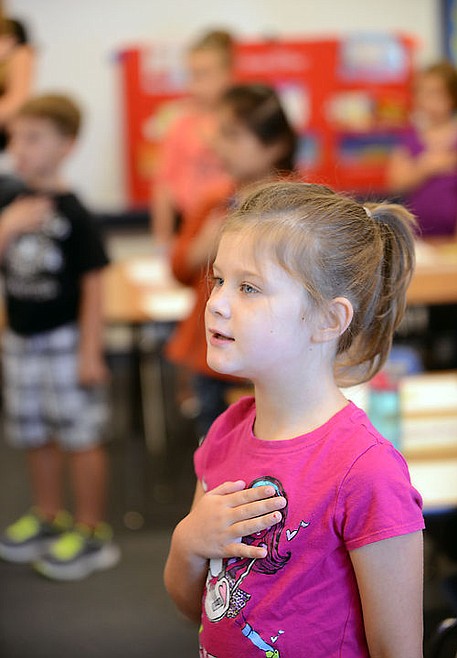Savanah Waters and other students rise to recite the Pledge of Allegiance in Tracy Ketchum's first grade class on Wednesday, August 27, on the first day of school at Elrod Elementary. (Brenda Ahearn/Daily Inter Lake)