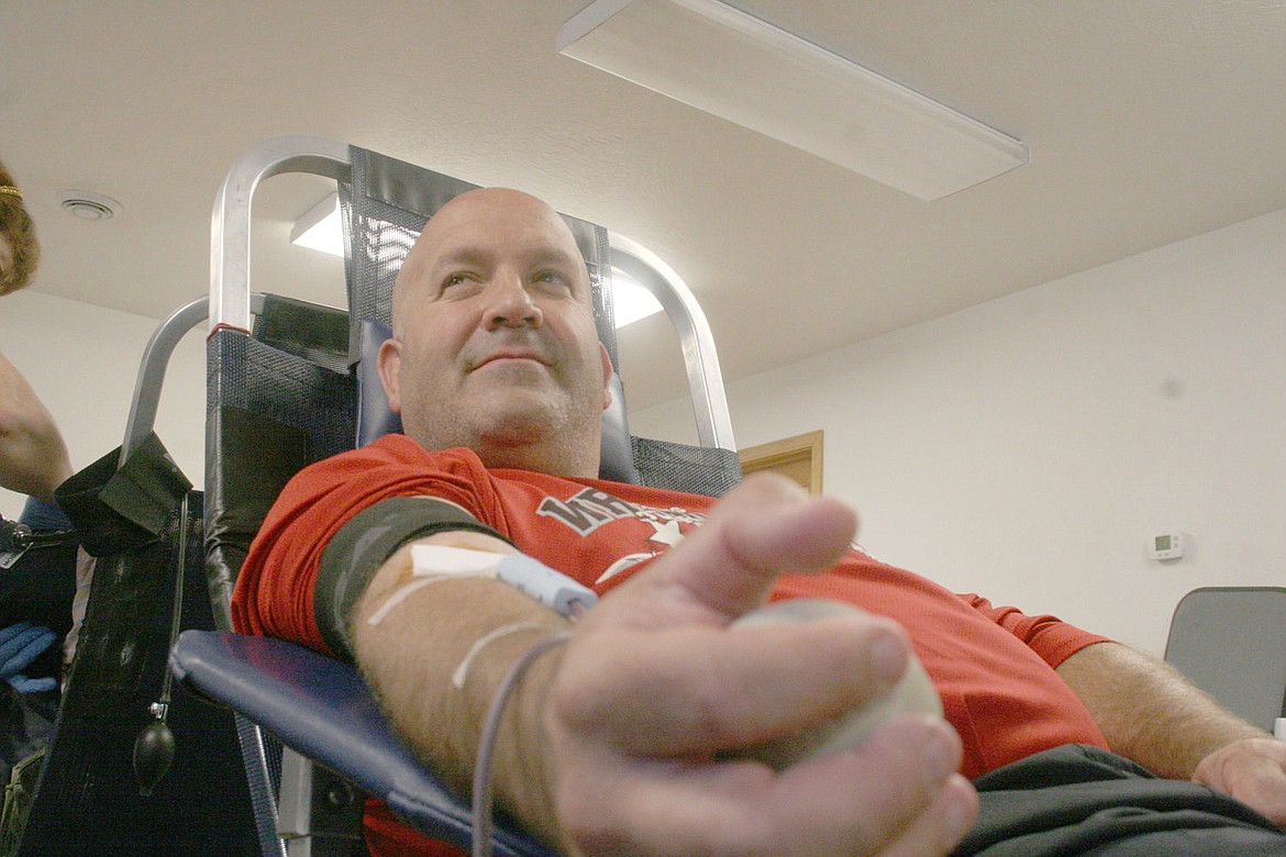 Mineral County Sheriff-elect Tom Bauer accepting his second challenge of the week by donating blood during a recent American Red Cross blood drive.