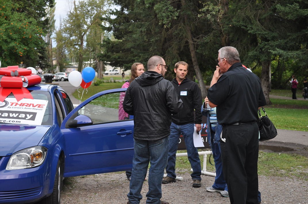 Jesse Mahugh, center, accepts a 2008 Chevrolet Cobalt from Travis, Loren and Denise Sallee, owners of Loren's Auto Repair in Kalispell. Mahugh is the first winner of the Wheels to Thrive program the auto body shop started to give back to the community.