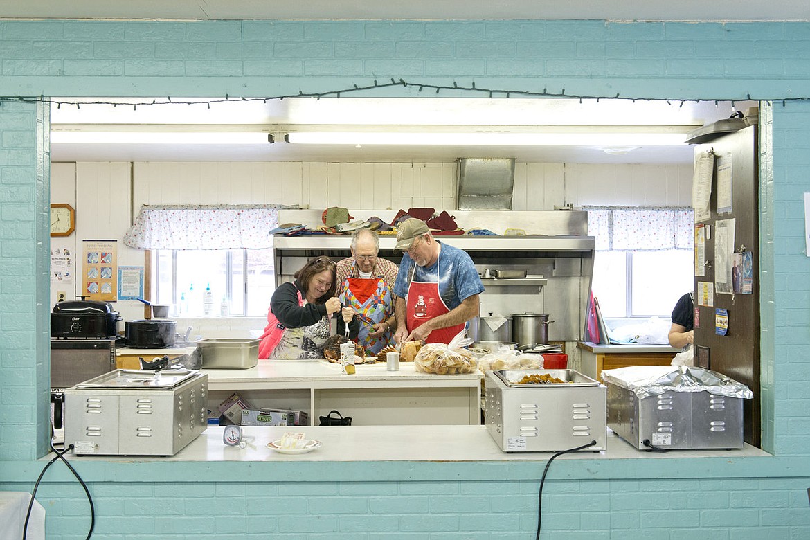 Karen Porfitt, Bobby Mayes and Dave Adams prepare the Thanksgiving dinner at the Assembly of God Church in Plains last Thursday.