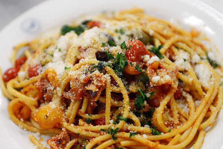 Detail of a plate of Bucatini alla Romana, made with pancetta, onions, fresh tomatoes and olives. The Bucatini noodles are from Rome. (Brenda Ahearn/Daily Inter Lake)