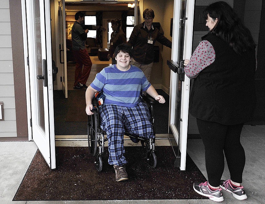 Skyler Schwegel wheels out of The Retreat at Buffalo Hill as his mom Cheryl Schwegel opens the door for him. Skyler, who lost part of his leg after an Aug. 31 vehicle accident, had been at the rehabilitation center since the beginning of October. Released from The Retreat on Nov. 26, the Whitefish High School sophomore is now recuperating at home.