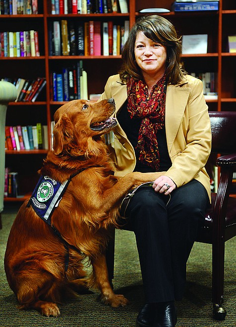Executive Director at the North Valley Hospital Foundation Michelle Drager sits with "Bean" the therapy dog on Nov. 25, in Whitefish.