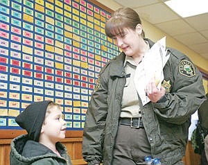 Talon Miguel, left, gets acquainted with his shopping partner Deputy Cathy Ruddock during Shop With a Cop day Thursday at Libby Elementary.