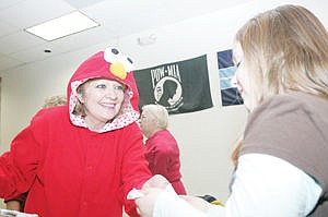 Shaelyne Viergutz, 9, receives a Christmas cookie from Tickle Me Elmo (Cynthia Curtiss).