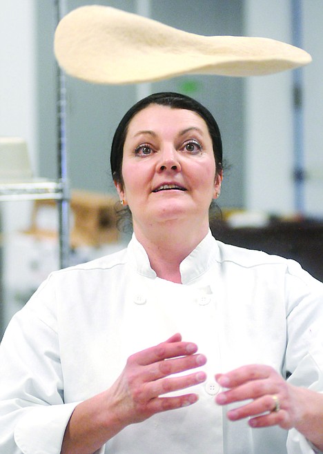 Lorie Hafer, Kalispell Public Schools assistant food service director, throws her dough in the air as she learns how to prepare homemade bread and pizza crust from Kalispell Regional Medical Center Chef Seth Bostick at the Kalispell Central Kitchen on Wednesday. The training of Kalispell and Bigfork bakers was part of a commitment to use local food products and increase cooking from scratch.