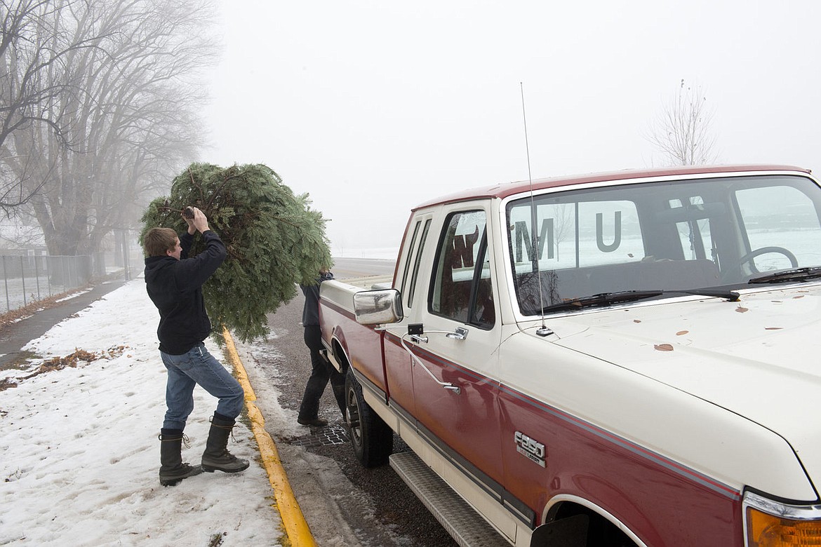 Bryce Henning and Jake Lile move a Christmas tree into a truck during the team's tree and wreath sale.