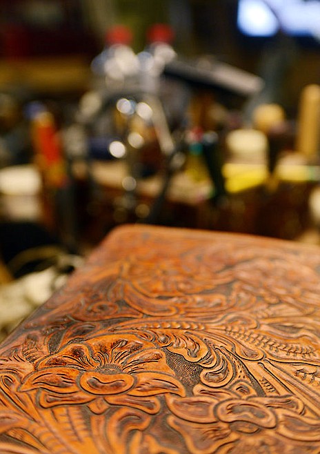 Detail of a leather notebook holder Stan Freeman created at least 30 years ago. He said it is not one of his first pieces, but it is definitely among his early work. (Brenda Ahearn/Daily Inter Lake)