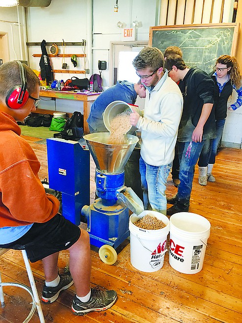 Flathead High School Woods I student Avery Knoll runs the school's pelletizer while student Tucker Nadeau watches for quality control. Flathead woods and International Baccalaureate students are entering a new business and curriculum venture this year making, marketing and selling wood pellets using recycled materials.