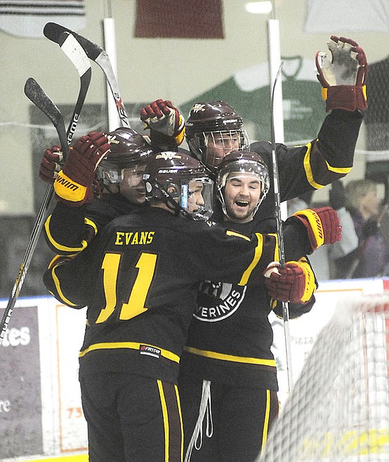 Members of the Whitefish Wolverines celebrate the first goal against the Butte Cobras at the Stumptown Ice Den on Friday. (Aaric Bryan/Daily Inter Lake)