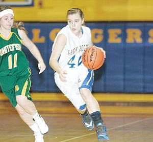 Devon Gallagher drives on Katie Fyall in first quarter vs. Whitefish. Gallagher started the scoring with a 3-pointer.