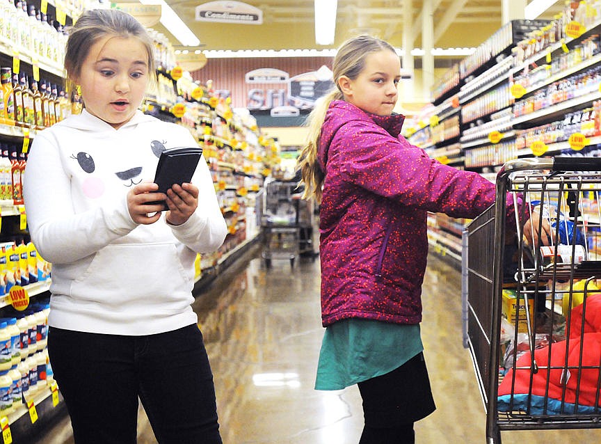 Creston fourth-grader Cecelia Wink, left, looks surprised as she adds up the cost of groceries as her classmate Geneva Simonson loads up the cart. About 30 Creston were at Super 1 Foods to purchase food for the Samaritan House. (Aaric Bryan/Daily Inter Lake)