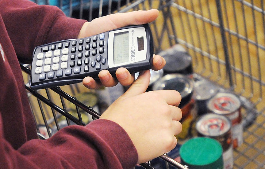 Creston sixth-grader Mark Bartos adds up the cost of his group's groceries. (Aaric Bryan/Daily inter Lake)