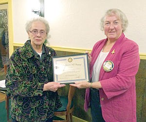 Cathy Burrell is recognized as the citizen of the month by the Rotary Club of Kootenai Valley at a meeting on December 8. Presenting the award is Rotarian Eileen Carney. Cathy was recognized for her many hours working for the community. She spends much time making quilts for deserving children who have little else. She volunteers at the Chamber of Commerce two days a week. Besides working for Koats for Kids, she is becoming involved in helping pick up contributions and organizing the effort. She helps out with the Community Thrift Store one day a week. She also volunteers at her church whenever a need arises. Rotary began recognizing volunteers who add so much to the community to make others aware of how much it takes to make our area such a great place to live.