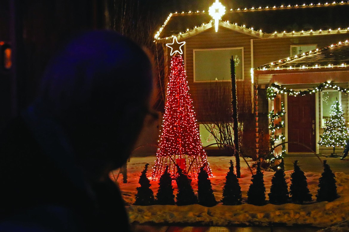 A passenger on the light tour peers out the window at a house with flashing lights timed to holiday music.