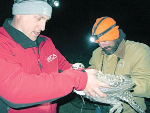 In this Sept. 15, 2014 photo, ecologists Jon Kehmeier, left, and Nate Wojcik inspect a female sage grouse captured at night at the future site of the 1,000-turbine Chokecherry-Sierra Madre wind farm outside Saratoga in south-central Wyoming. Efforts to conserve a struggling species of grouse that ranges across the Western U.S. are having far-reaching effects on the region’s energy industry as the Obama administration decides whether the bird needs more protections. Sales of leases on 8.1 million acres of federal oil and gas parcels - an area larger than Massachusetts and Rhode Island combined - are on hold because of worries that drilling could harm greater sage grouse, according to government data obtained by The Associated Press. The U.S. Bureau of Land Management’s delay on the parcels underscores just how much is at stake for an industry that finds its future inextricably intertwined with a bird once known primarily for its elaborate mating display. (AP Photo/Mead Gruver)