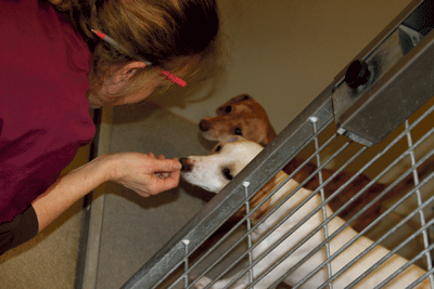 The dogs shouldn’t have too much trouble finding homes. Chickpea, an eight-month-old short-haired Chihuahua/terrier mix, readily emerged from her crate and sniffed out her new surroundings and volunteers.
