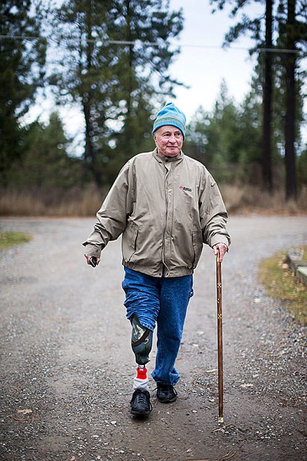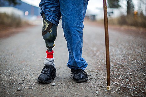 COEUR d'ALENE - Bradford Bakie answered the front door of his trailer home Tuesday with his right pant-leg scrunched above his knee, showing off his prosthetic leg.