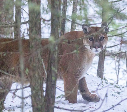 “I stopped to listen and look around, and I heard a crunch in the snow behind me and to the left,” he said. “Then I saw a full-grown adult mountain lion moving through the thick trees at very close range.”