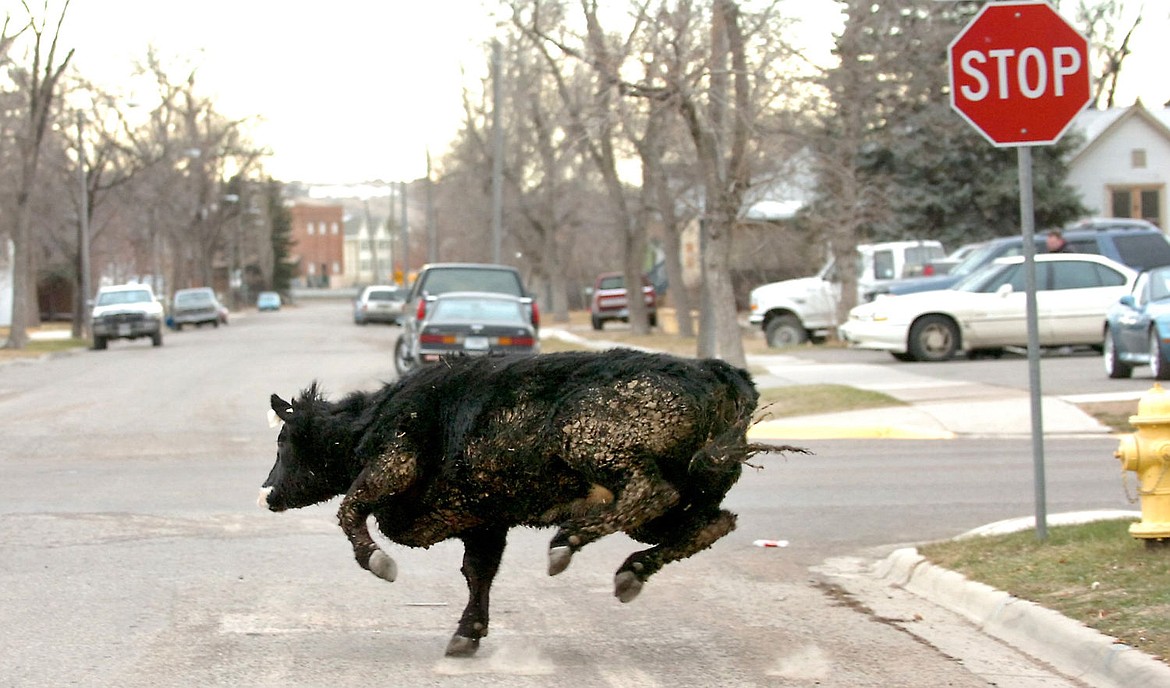 A cow named Molly B makes a dash onto Eighth Avenue South in Great Falls while running from law enforcement officers on Jan. 5, 2006. Molly B jumped a 5 1/2-foot fence at a slaughterhouse and led authorities on a six-hour chase across the Missouri River and several neighborhoods. (AP file photo/Robin Loznak)