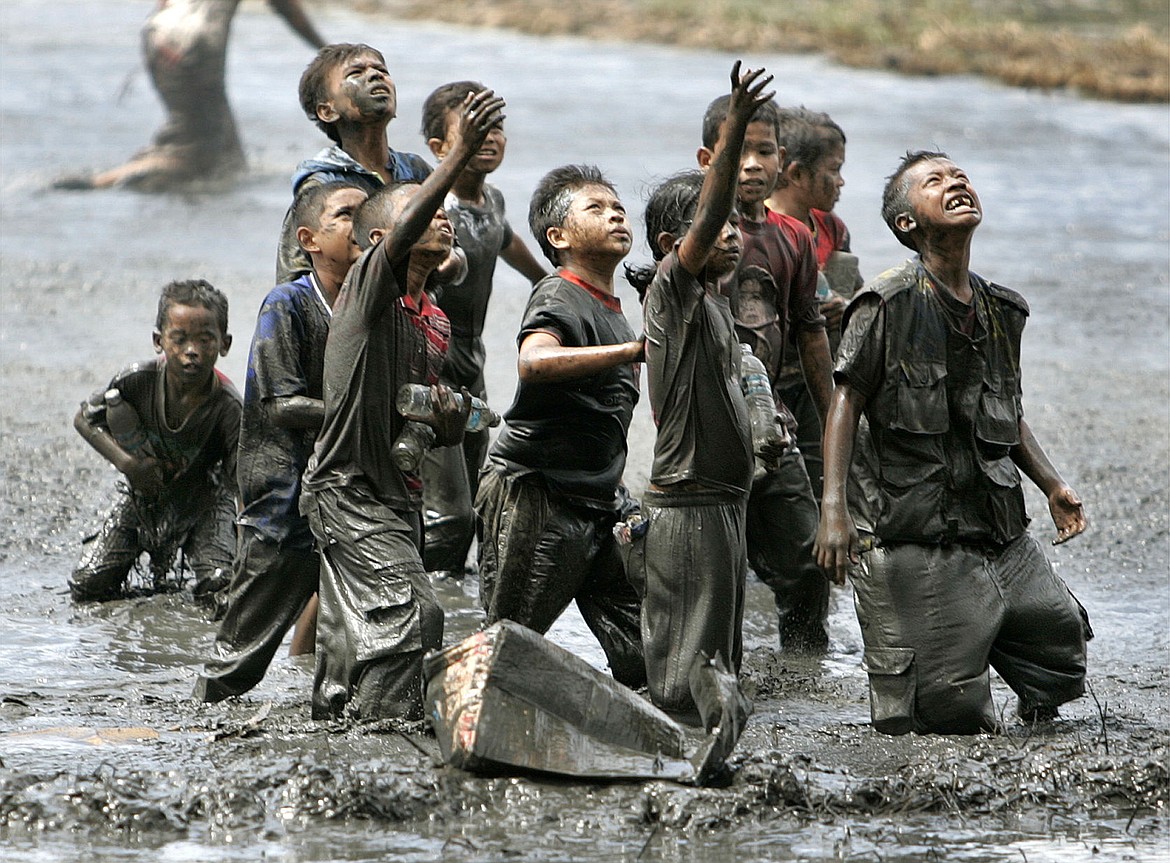 Refugee children try to catch relief goods tossed from an Australian military helicopter in a rice paddy on the outskirts of Banda Aceh, Indonesia, in January 2005. Aceh was hardest-hit by the Dec. 26, 2004, quake-spawned tsunami that killed more than 115,200 people in the northernmost province on Sumatra Island. Across Southeast Asia, nearly a quarter-million people were killed by the tsunami. (AP photo)