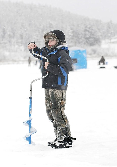 Jacob Ost, 9, drills a hole in the ice with an auger during the fishing derby on Saturday. (Aaric Bryan/Daily Inter Lake)
