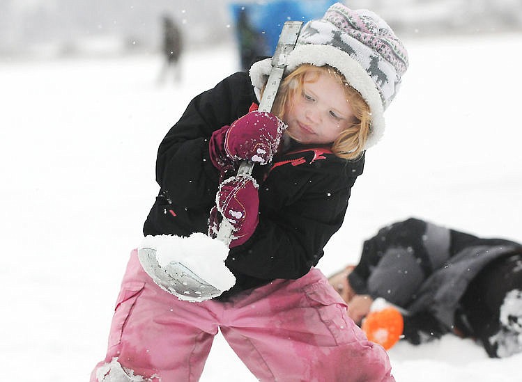 Maddy Smith shovels snow with a ice fishing ladle during the fishing derby on Saturday. (Aaric Bryan/Daily Inter Lake)