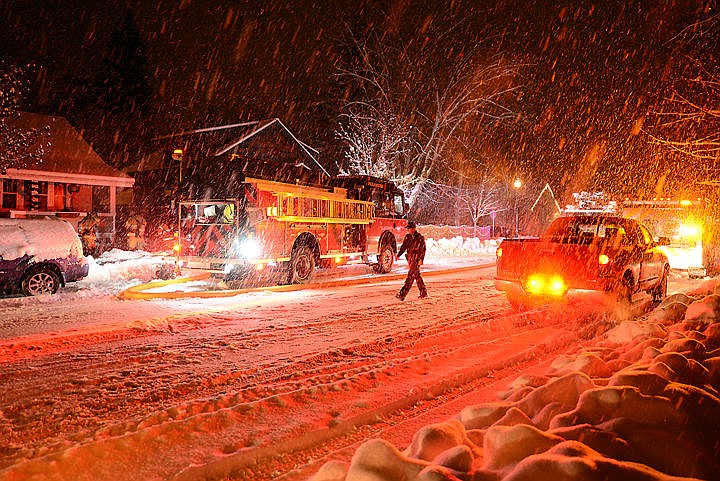 A WHITEFISH POLICE OFFICER makes his way past fire engines from the Whitefish and Kalispell fire departments, which had been called out to a possible structure fire at 824 Second Street East in Whitefish, on Dec. 27.