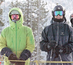 Dan Koestler, left, and Sam Sheron of Whitefish are first to board the ski lift kicking off Turner Mountain's 2014-15 season.