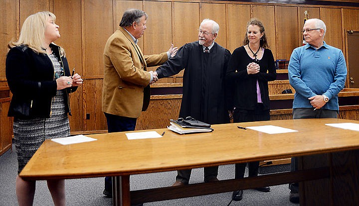 Phil Mitchell shakes hands with District Judge Ted Lympus after being sworn in as a new Flathead County commissioner on Wednesday morning in Kalispell. Also taking oaths of office were, from left, Debbie Pierson, the new clerk and recorder; Adele Krantz, who was re-elected as treasurer; and Jack Eggensperger, the new superintendent of schools. (Brenda Ahearn/Daily Inter Lake)