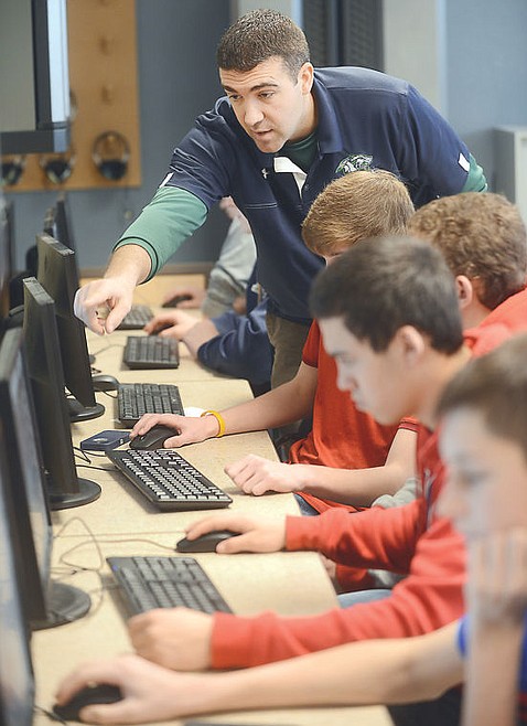 Andy Fors helps students in his Introduction to Engineering Design class on Friday, January 31, at Glacier High School in Kalispell. (Brenda Ahearn/Daily Inter Lake)
