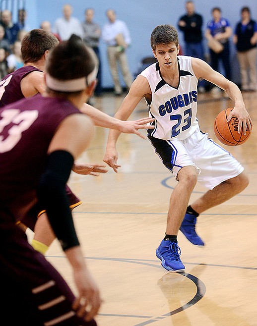Stillwater senior Jeremiah Hashley (23) driving the ball during the game against Troy on Tuesday, February 4, in Kalispell. (Brenda Ahearn/Daily Inter Lake)