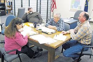 Clerk and Recorder Tammy Lauer, left, Commissioners Tony Berget, Ron Downey and Mike Cole, discuss county tax numbers.