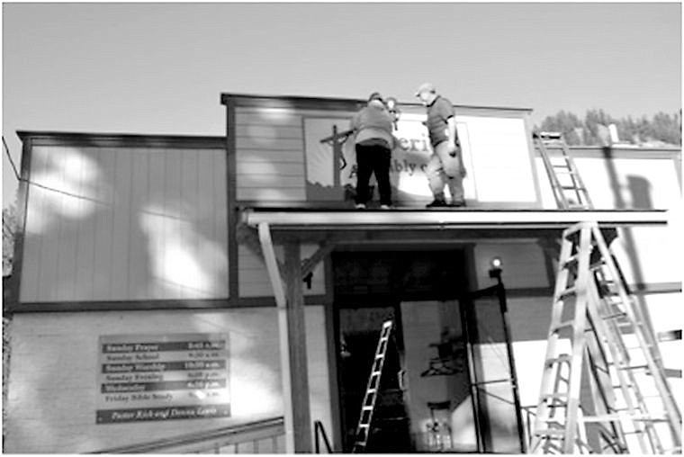 Ginger Deronneback and Pastor Rick Lewis secure the new sign to the facade of the Assembly of God church.