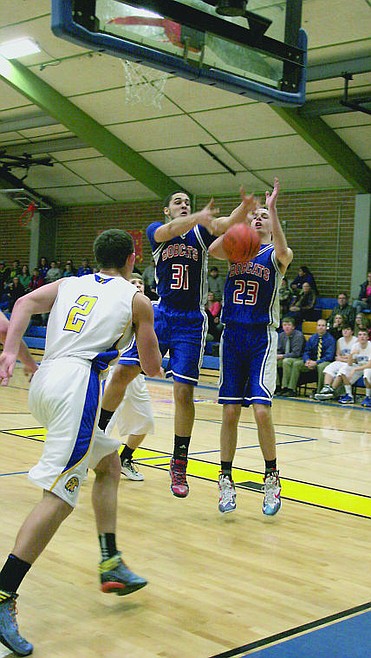Jarrod Tippens and Clint Voll lunge for the rebound during their game in Thompson Falls on Tuesday, January 28.