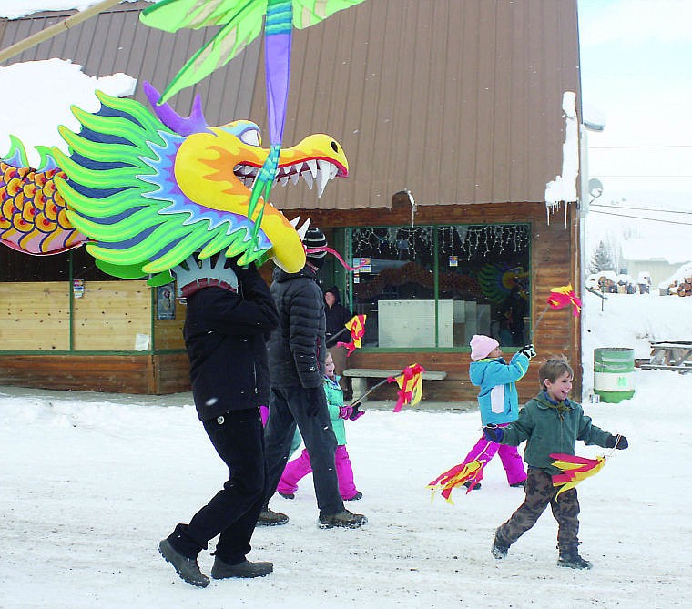 Robert Dobrovolny and Paul Stelter took turns holding the heavy paper maché dragon head as they marched up and down Main Street.