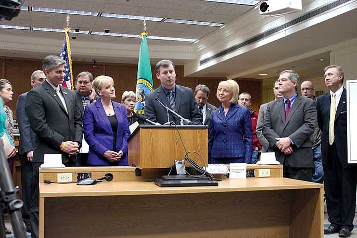 Rep. Matt Manweller (R-Ellensburg) joined his fellow 13th District legislator at the podium, advocating for his bill to reestablish tax breaks for rural county businesses.
