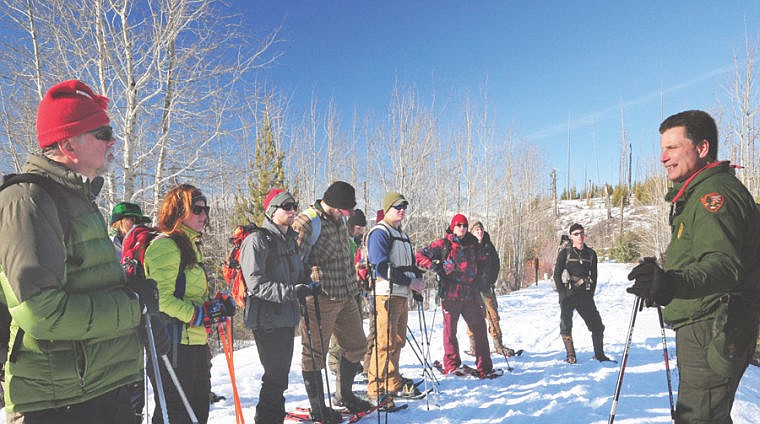University of Montana President Royce Engstrom, left, joins a class on snowshoes with Glacier National Park North Fork Ranger Scott Emmerich two weeks ago. Engstrom participated in several days of the Montana’s Mountains course that’s based in Polebridge.