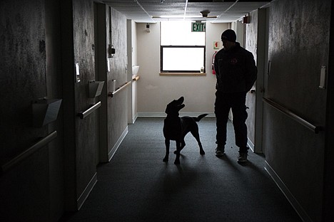 The dog's quick, excited breaths are visible during the early morning training exercise at an abandoned four-story building in Coeur d'Alene.