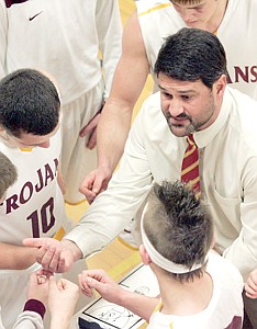 Junior swingman Gage Tallmadge heard his coach’s message loud and clear. Tallmadge scored 22 of his game-high 27 points in the second half, including six three-pointers. Tallmadge drained a trio of three-pointers in the third quarter and the Trojans stormed to 39-32 lead.