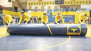 The Greenchain rolls up the mat for the last time Saturday following the Northwestern Class A Divisional Championship with Zach Crace, left, Braydan Thom, Reed Christensen, Dylan Parrish and Garret Chapel.