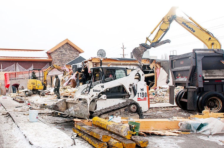 Robinson Sand & Gravel crews tear down the Town Pump convenience store and Magic Diamond Casino Wednesday morning at the intersection of Reserve Drive and U.S. 2 in Evergreen. A new convenience store and casino, built by Swank Enterprises starting in mid-July last year, is now open for business. A new island of fuel pumps and more parking will be built later this spring.