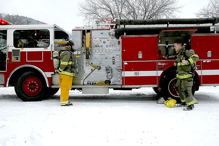 Superior Volunteer Firefighters Cody Crusson and Mike Kenyon suit up as they prepare to enter a house to fight the fire within. The fire was called in late Sunday afternoon.
