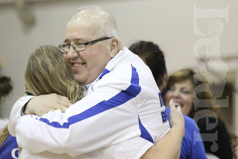 Assistant coach Terri Biggs, who spent most of Rice’s career as his assistant on the bench, asked all of those athletes—which ranged in age from eight to in their 40s—to stand at center-court facing Rice as they presented him with awards that included a mounted basketball and special recognition from Glen Welch and Russ Hansen of the Missoula Officials Association.