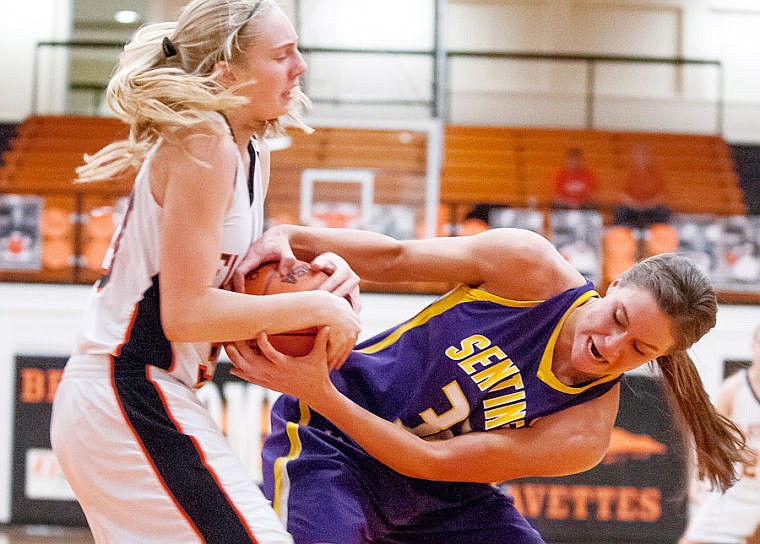 Flathead freshman guard Tiana Johnson (left) fights for a rebound with Missoula Sentinel senior forward Olivia Roberts Friday night during Flathead's home loss to Missoula Sentinel. Feb. 14, 2014 in Kalispell, Montana. (Patrick Cote/Daily Inter Lake)