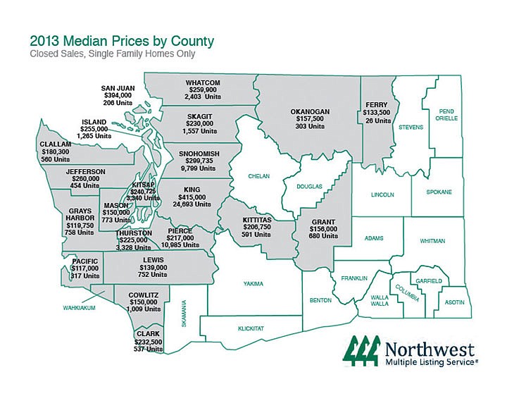The median price for 2013 sales was $270,000, up just over 10 percent from 2012's median price of $245,000. Median prices ranged from $118,750 in Pacific County to $372,000 in King County, according to the Northwest MLS.