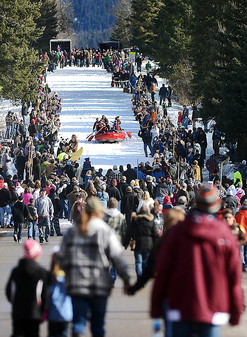 A big crowd of fans gathers on Sugar Hill in Martin City on Saturday for Barstool Ski Races at the 36th Annual Cabin Fever Days. (Brenda Ahearn/Daily Inter Lake)
