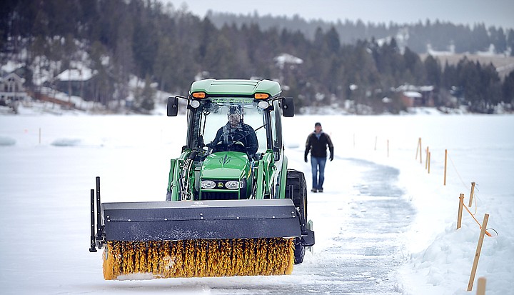 Tyler Belston of Wicked Clean and Columbia Tractor Works of Columbia Falls clears snow from a section of Foy's Lake on Monday, February 17. This section of the lake will be host to the Pond Hockey tournament that begins on Friday. (Brenda Ahearn/Daily Inter Lake)