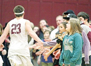Fans congratulate after Trojans pull out a 64-61 'squeaker' over Mission Saturday.