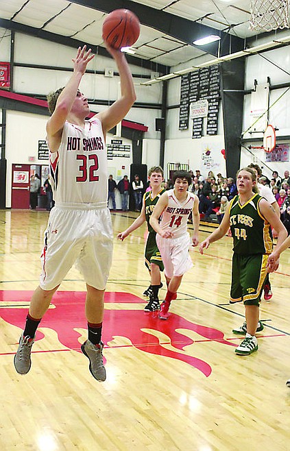 Hot Springs Savage Heat player Nate Gray takes a shot in the Tuesday night game against the St. Regis Tigers.
